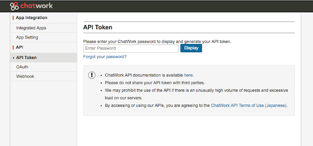 首先登入 ChatWork ,取得名為 ChatWork API 的 token 。如沒有這 token 的話,就無法連動 Jooto 與 ChatWork。其實非常簡單輕鬆就可完成這道手續。